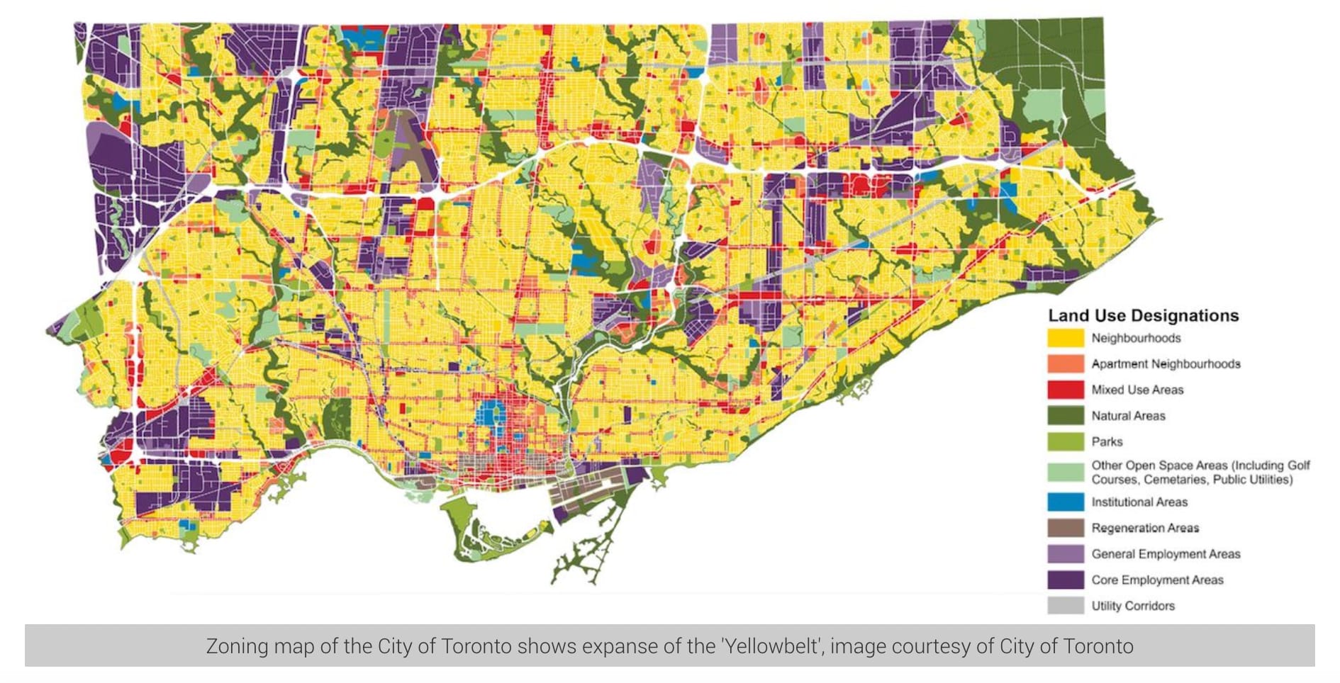 Colloquially known as the ‘yellowbelt’, the vast majority of land in Toronto falls within the restrictive zoning designation of Neighbourhood Areas, which appear in yellow on the City’s zoning map. Among the suite of limitations that all buildings within these areas are subject to, the most impactful, arguably, has been the permission of only a single dwelling per lot.