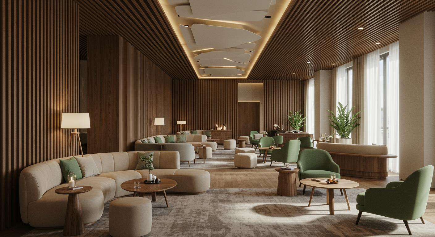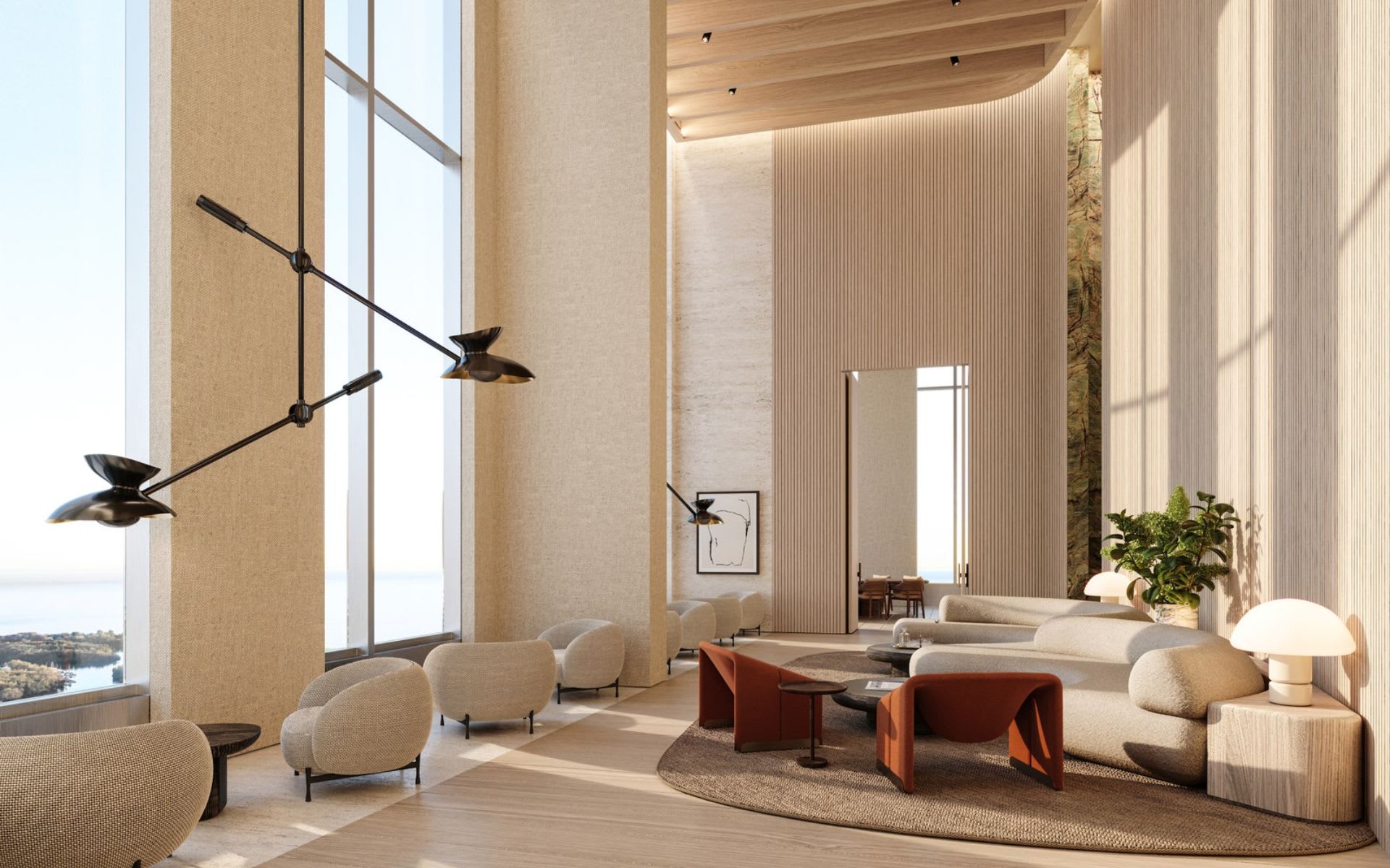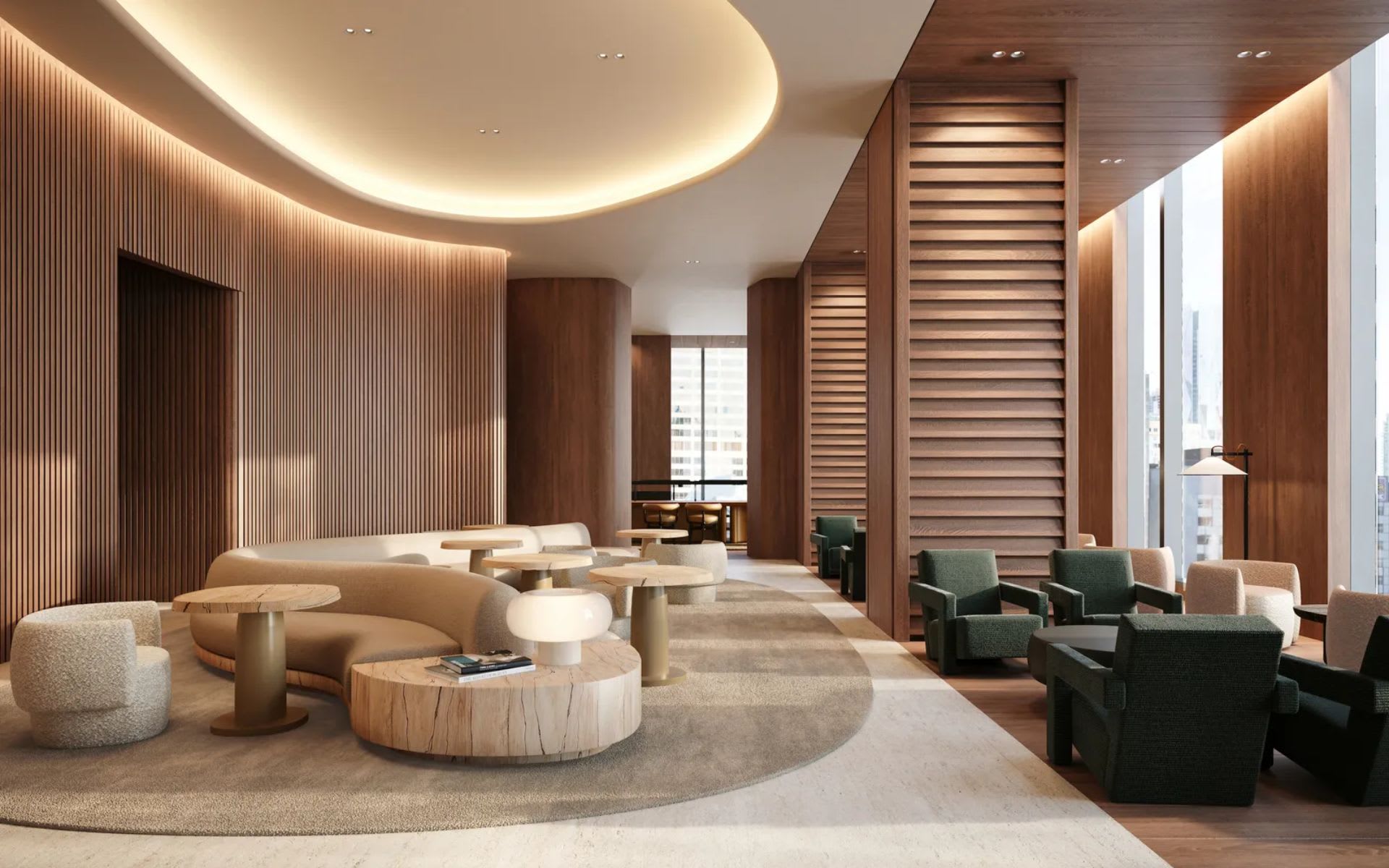 Residents will have access to a creator club, which will house coworking spaces, meeting rooms, and a maker studio. The light-filled gathering space is accented with wood slat paneling and modern earth-toned furnishings with more than enough room for working collaboratively or independently. “Our intention was to craft purposeful spaces that oscillate between social and serene,” Ferrari said.