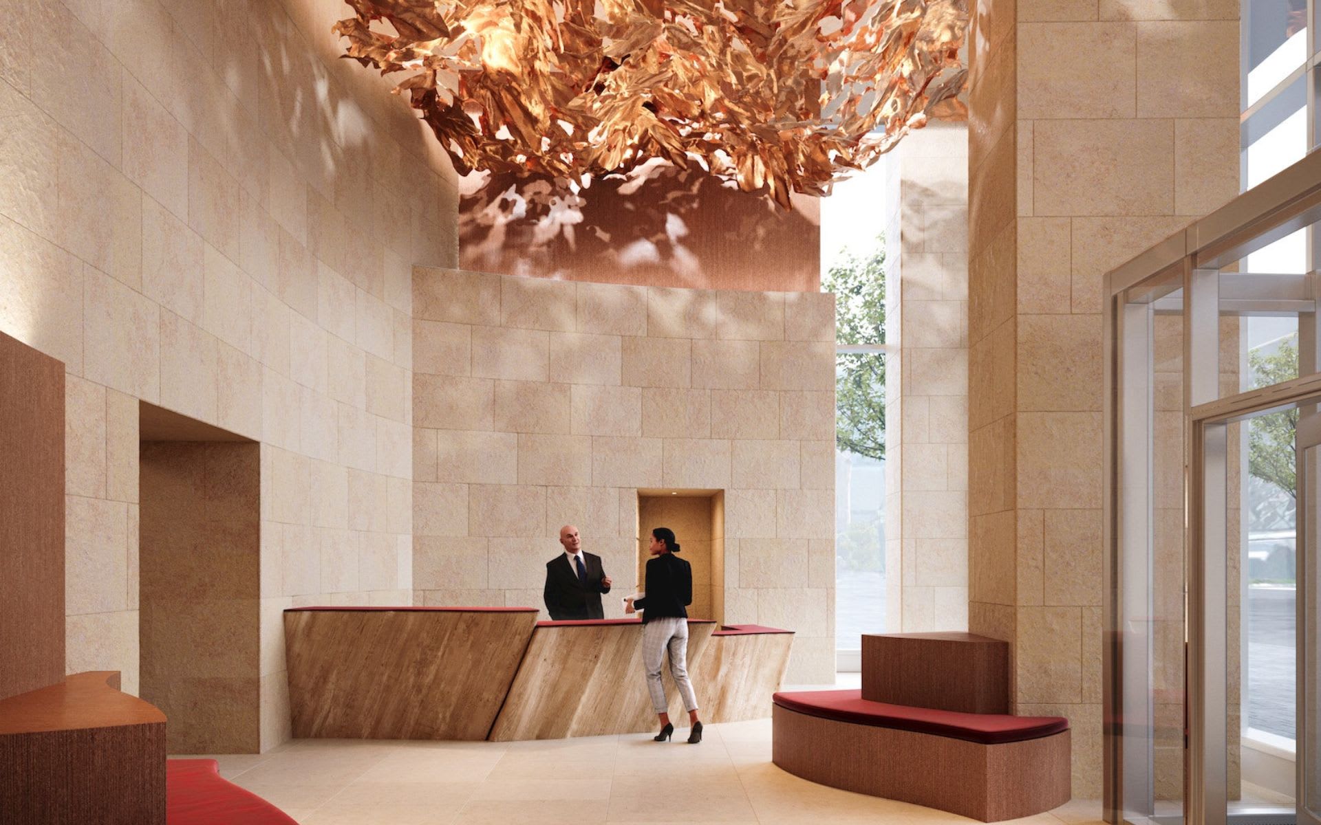“Every city in the world has its own light, and the light is modified by the buildings in the city,” Gehry said. “I wanted this building to capture the essence of Toronto.” Gehry drew inspiration from The Group of Seven, a collective of Canadian landscape painters, when designing the lobby in the east tower. The current plans for this entrance space include limestone walls and floors, sculptural Scandinavian-inspired furniture, and a hanging art installation Gehry designed inspired by maple leaves.