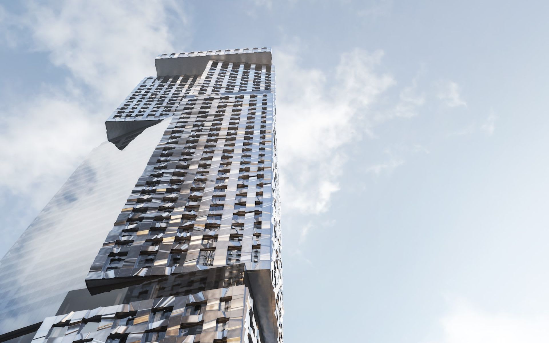 In classic Gehry form, the towers are designed in a deconstructivist style, though not as fragmented as some of his previous work. Both towers are constructed from offset blocks stacked at alternating angles with a reflective glass and stainless steel cladding on the façade. The result is a building that appears to exist at a constant rotation, twisting and turning and offering a distinct look from every angle. This illusion is meant to evolve further over the course of the day as the light changes and reflects off the geometric exterior.