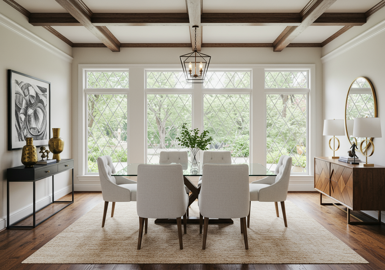 Combining a portion of an original 1898 Craftsman home and a 1950s addition, this unique three-bedroom residence is enveloped by lush, flourishing greenery near Brookside Park, the iconic Rose Bowl, and numerous museums in Pasadena. Classical details—among them ornate leaded- and stained-glass windows and stately carved and coffered ceilings—harmonize with pleasingly minimalist midcentury elements and spaces, such as a window-walled family room with an oversized brick fireplace and a pitched beamed ceiling.