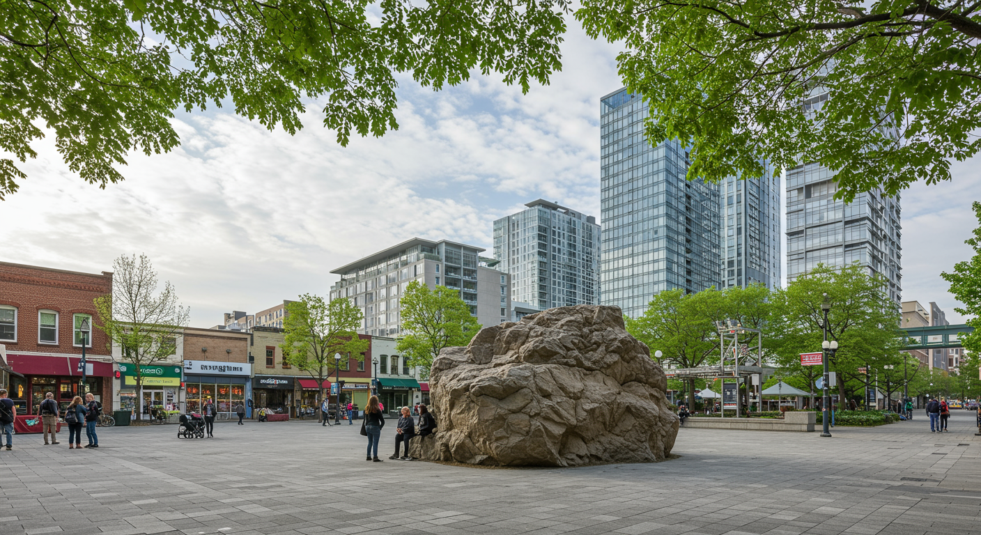 The lush community greenspace is the result of an international design competition and features a number of distinctive landscaping elements, including a 700-ton piece of Muskoka granite transplanted from the Canadian Shield, a fountain designed to mimic a rain curtain, and 11 geographically unique plant gardens. Each plot has been designed to showcase a different element of the Canadian landscape (upland forests, crab-apple orchards, marshy wetlands and more) and garden borders trace the former property lines of the heritage homes that once stood on the land.